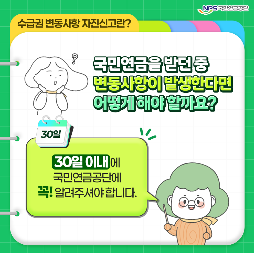국민연금 수급권 변경 신고는 단순한 행정 절차가 아니라 연금을 정확히 수령하고 가족의 권리를 보호하기 위한 필수적인 의무입니다. 주소, 성명, 혼인 상태, 국외 이주, 사망 등 어떤 변화라도 발생하면 즉시 공단에 신고하여 불필요한 불이익을 예방하시기 바랍니다. 온라인·모바일·오프라인 모든 경로가 제공되므로 상황에 맞는 방법으로 신고하시면 됩니다.