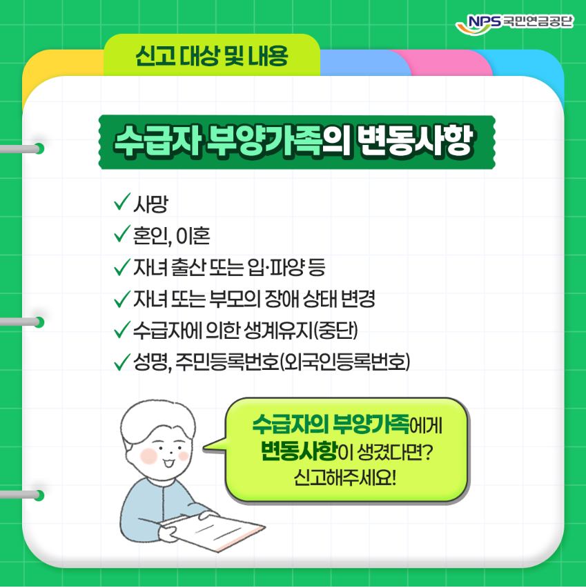 국민연금 수급권 변경 신고의 대상은 연금을 수령하고 있는 모든 수급자와 그 유족입니다. 신고 대상 사유는 단순한 연락처 변경에서부터 혼인·이혼, 개명, 국외 이주, 사망에 이르기까지 광범위합니다. 아래 표는 대표적인 신고 사유와 필요 서류, 그리고 공단이 반영하는 내용을 정리한 것입니다.