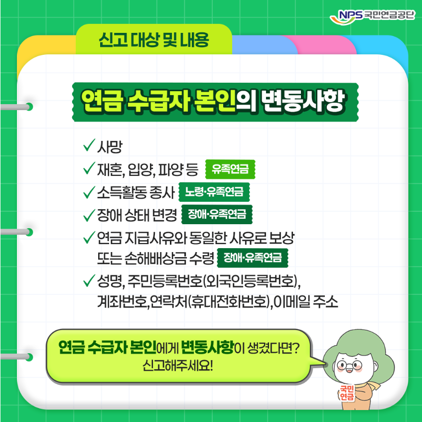 주의: 고의로 신고를 누락하여 연금을 계속 수급하는 경우 부당이득 환수 및 형사적 책임이 따를 수 있습니다. 모든 변경 사항은 성실히 신고하시기 바랍니다.