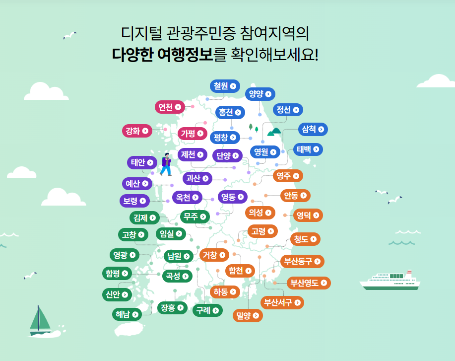 디지털 관광주민증은 인구감소 지역을 중심으로 운영되며, 매년 참여 지역이 확대되고 있습니다. 예를 들어 다음과 같은 지역들이 참여한 바 있습니다.