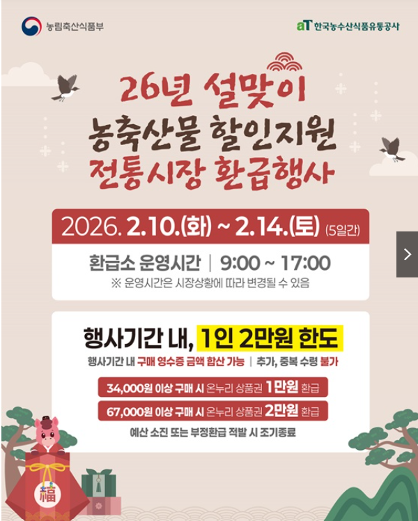 2026년 설 명절을 앞두고 정부가 추진하는 '설맞이 농축산물 할인지원 전통시장 환급행사'가 2월 10일부터 14일까지 전국 전통시장에서 진행됩니다. 이번 행사는 명절 물가 상승으로 인한 소비자 부담을 줄이고, 동시에 전통시장 활성화를 위해 마련되었습니다. 행사 기간 동안 국산 농축산물을 구매하면 일정 금액에 대해 현장에서 바로 환급을 받을 수 있어, 장바구니 체감 비용 절감 효과가 크게 나타납니다.