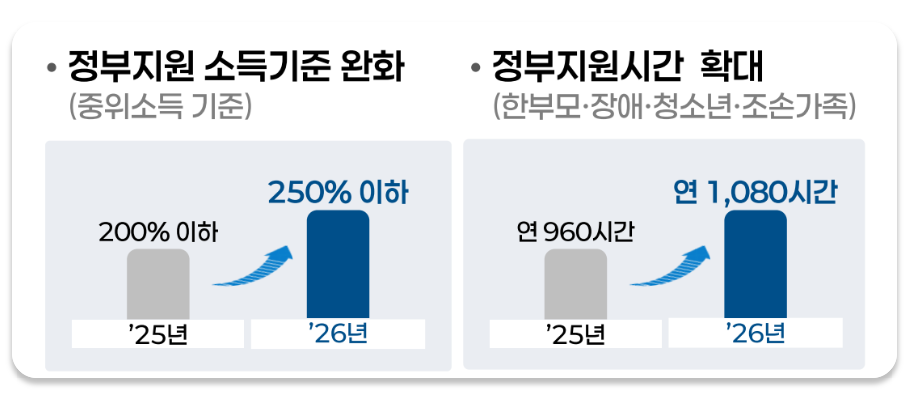 한부모 가정, 조손 가정, 장애 부모 또는 청소년 부모 가정처럼 돌봄 부담이 큰 가구는 정부 지원 시간을 기존 연 960시간에서 연 1,080시간까지 확대 지원받을 수 있습니다. 또한 인구감소지역에 거주하는 경우에는 본인 부담금의 일부를 추가로 경감받을 수 있는 혜택도 마련되어 있습니다.
