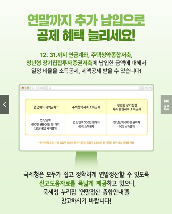 연말이 되기 전에 본인의 연간 소득과 지출 내역을 점검하고, 공제 한도가 남아 있는 항목을 확인하는 것이 중요합니다. 연금저축, 개인형 퇴직연금(IRP), 기부금 등은 연말에 추가 납입을 통해 절세 효과를 높일 수 있어 사전 준비가 환급액 차이에 큰 영향을 미칩니다.