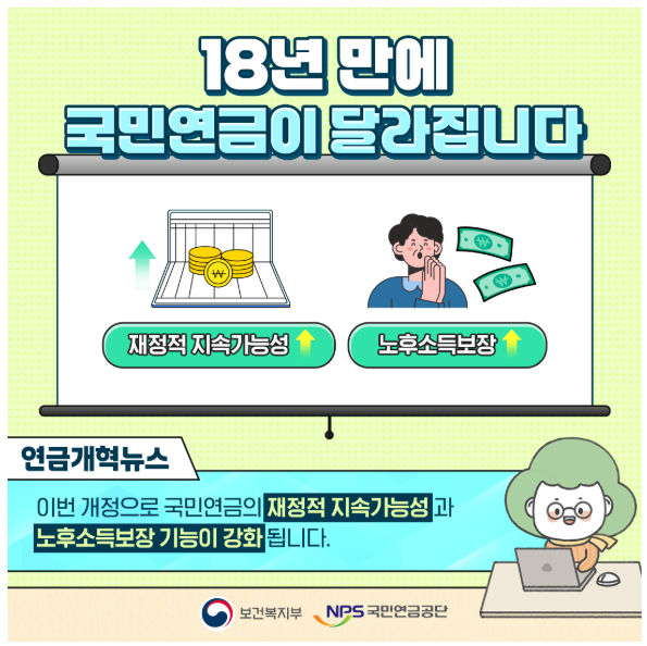 2026년 1월 1일부터 국민연금 제도가 여러 면에서 주요하게 달라집니다. 이 변화는 단순히 ‘더 많은 보험료를 내는 것’이 아니라, 국민연금의 지속 가능성 강화와 연금 수령자에 대한 보장 확대라는 큰 틀 아래 이루어졌습니다. 특히 보험료율과 소득대체율, 출산·군복무 크레딧 확대, 저소득층 지원 강화, 국가 지급 보장 명문화 등의 내용이 적용되면서 향후 가입자들의 부담과 수혜 구조가 동시에 바뀌게 됩니다. 이러한 변화는 연금 제도의 장기적인 안정성을 높이고, 보다 공정하고 촘촘한 노후 보장을 목표로 하고 있습니다.