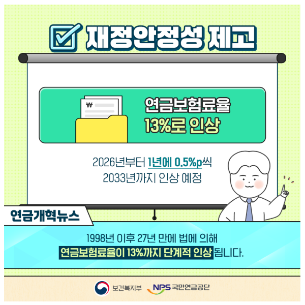 2026년부터 국민연금 보험료율은 기존 9%에서 9.5%로 인상되며, 이후 2033년까지 매년 0.5%포인트씩 단계적으로 올라 최종 13%까지 적용됩니다. 이는 연금 제도의 재정 건전성을 강화하기 위한 조치로, 가입자가 납부하는 보험료 총액은 증가하지만 그만큼 장기적으로 연금 수령액도 증가할 가능성이 높습니다.