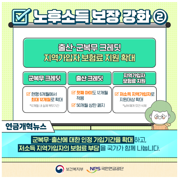 이외에도 출산 및 군복무 크레딧 혜택 확대, 국가지급보장 제도 명문화, 그리고 저소득 지역가입자에 대한 보험료 지원 확대 등의 사회적 지원 강화 조치도 함께 시행됩니다