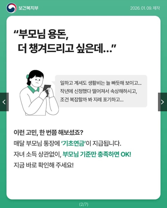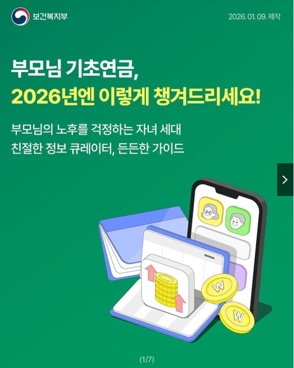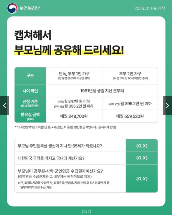 2026년에도 기초연금은 부모님의 노후 생활을 안정적으로 지켜주는 핵심 제도로 유지됩니다. 물가 상승과 의료비 부담이 계속되는 상황에서 매달 고정적으로 지급되는 기초연금은 생활비와 병원비에 직접적인 도움이 됩니다. 특히 2026년에는 소득 인정액 기준과 단독가구, 부부가구 지급 체계가 명확히 적용되어 자격만 충족하면 안정적으로 수령할 수 있습니다. 연세가 있으신 부모님을 대신해 자녀가 미리 확인하고 준비해 두면 신청 과정에서 불편을 크게 줄일 수 있습니다.