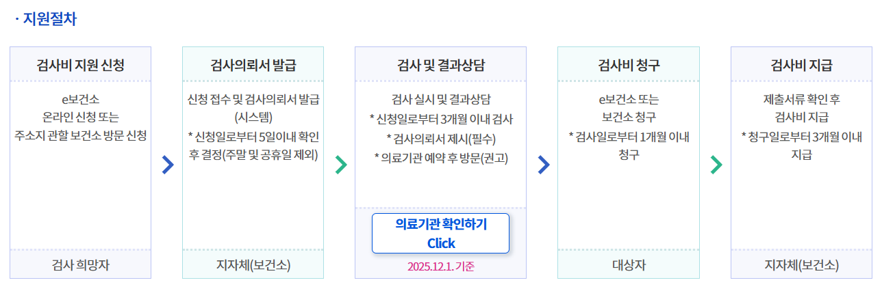 | 지원 방식 | 지정 의료기관 이용 | 검사 후 비용 환급 또는 감면 |