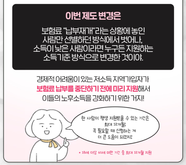 다만 사업장가입자, 직장가입자, 이미 다른 보험료 지원 제도의 적용을 받고 있는 경우에는 중복 지원이 제한될 수 있습니다. 또한 일정 수준 이상의 소득이나 재산이 확인되면 지원 대상에서 제외될 수 있으므로, 신청 전 본인의 가입 유형과 소득 상태를 확인하는 것이 중요합니다.